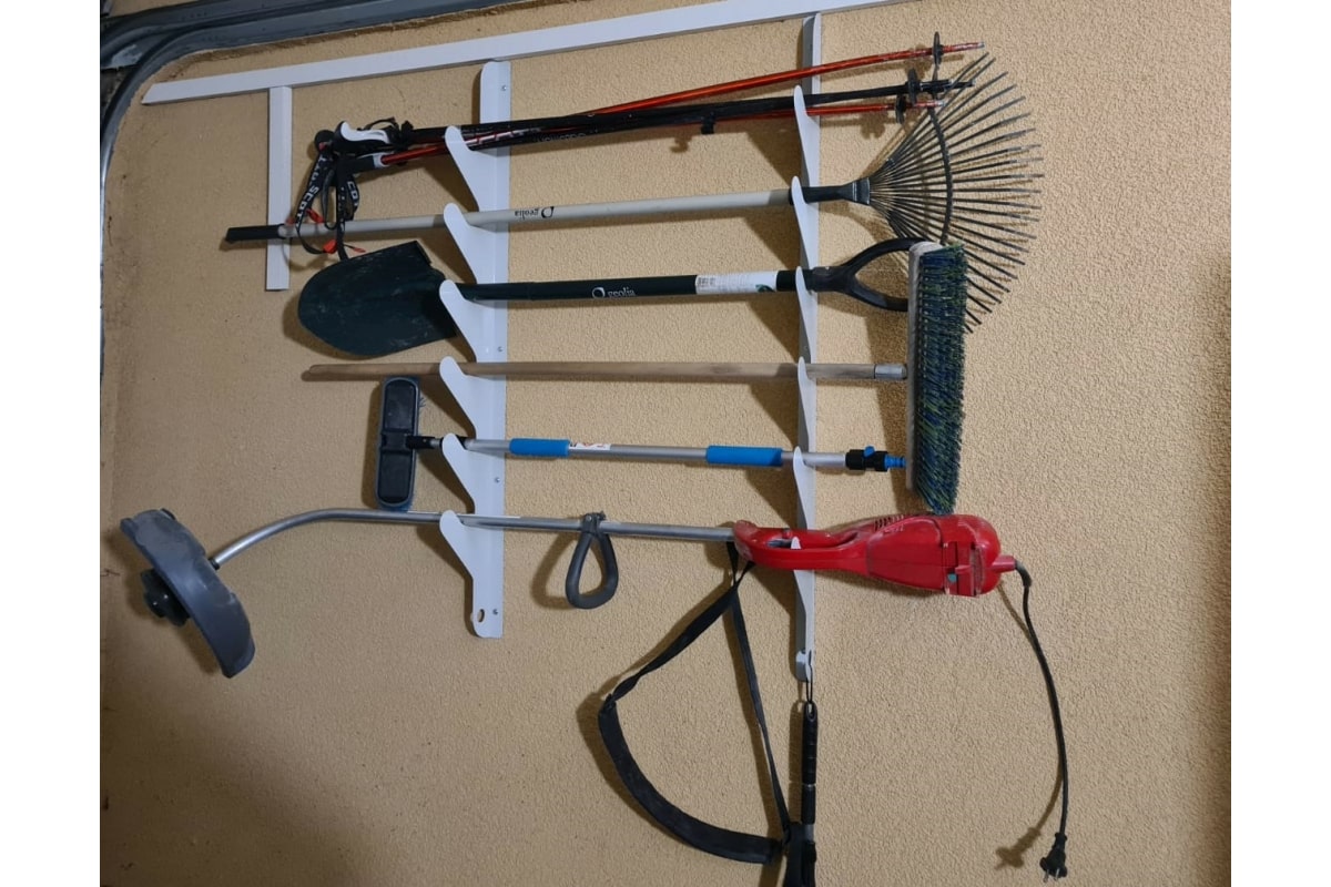 Внизу имеется отверстие d-2.5 см, в которое можно дополнительно вставить черенок с крючками для подвешивания более мелкого инструмента. Черенок и крючки в комплект не входят.