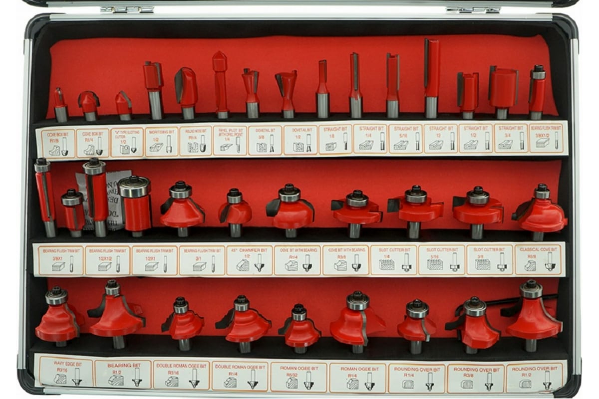 Набор фрез по дереву 35 предметов, хвостовик 8 мм Gigant G100-003 предназначен для фрезерных машин и фрезерных станков. Применяется для обработки древесины. В наборе 35 фрез различного профиля.