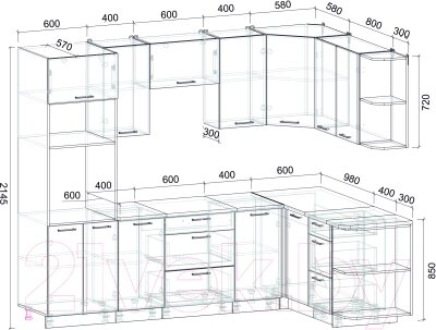 - Глубина нижних шкафов 60 см