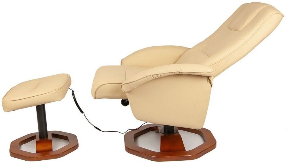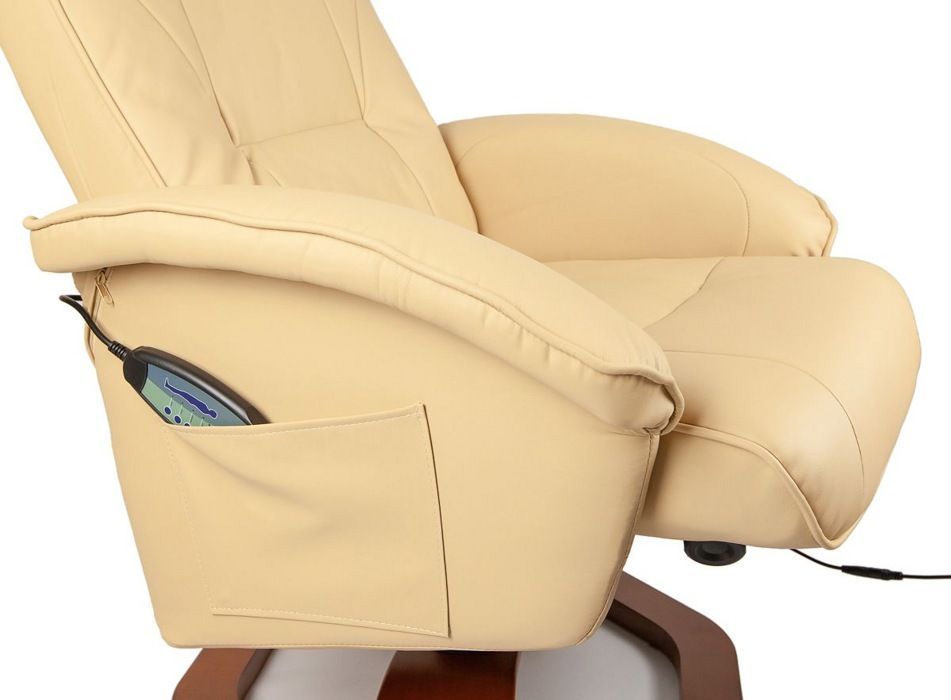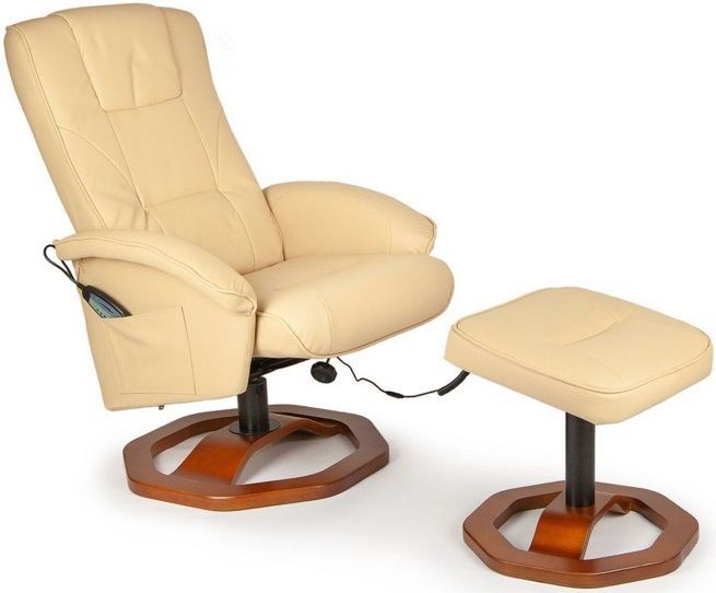Вид массажа: разминающий, расслабляющий. 8 точечный массаж (6 точек в кресле + 2 в пуфе). Количество программ массажа: 10. Дистанционное управление: пульт ДУ. Функция подогрева. Функция таймера. Угол наклона спинки 120°. В комплекте имеется пуф (подставка для ног). Размер пуфа 48 х 45 см.