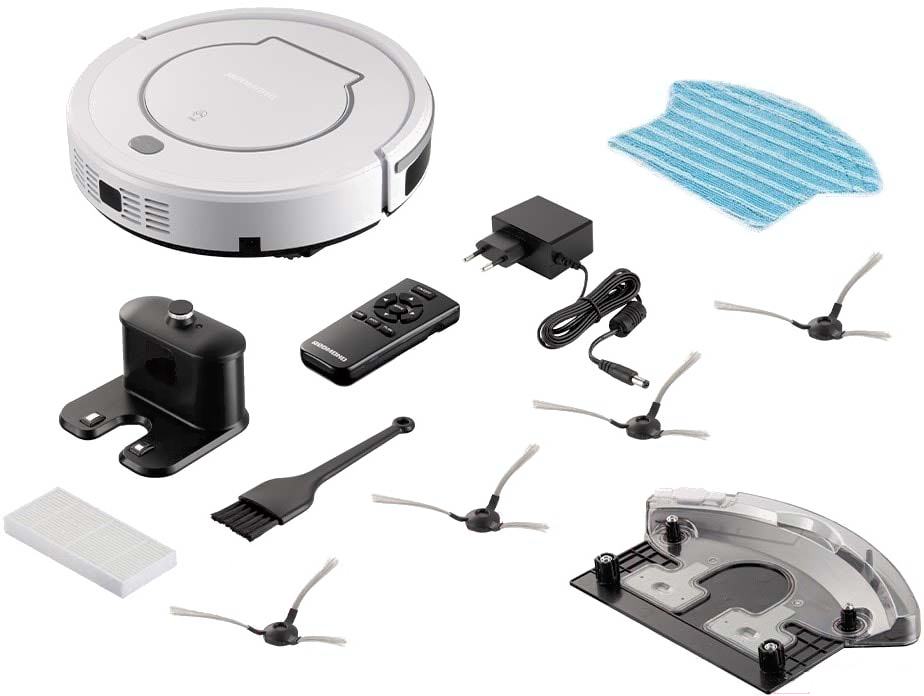 • В комплекте контейнер для влажной уборки, зарядная станция, адаптер питания, пульт ДУ, щеточка для очистки, документация, салфетки из микрофибры, боковая щетка (4 шт), фильтр (HEPA), контейнер для сухой уборки