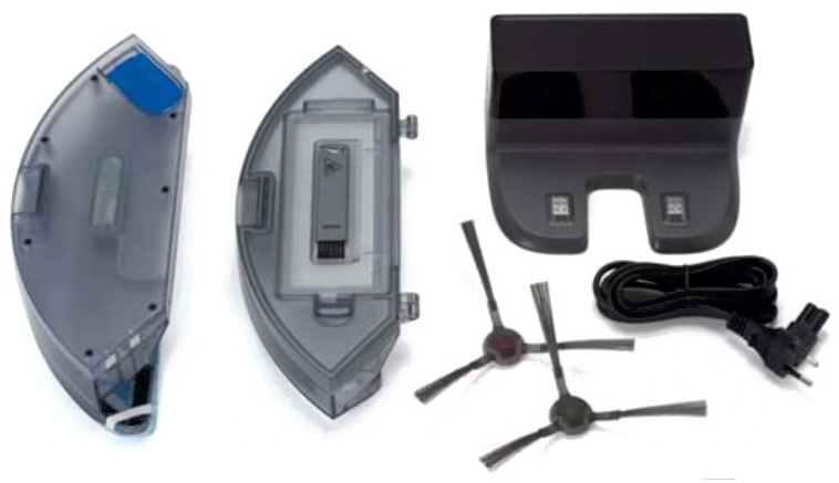 • В комплекте контейнер для влажной уборки, зарядная станция, адаптер питания, салфетки из микрофибры, боковая щетка (4 шт.), фильтр (HEPA), контейнер для сухой уборки