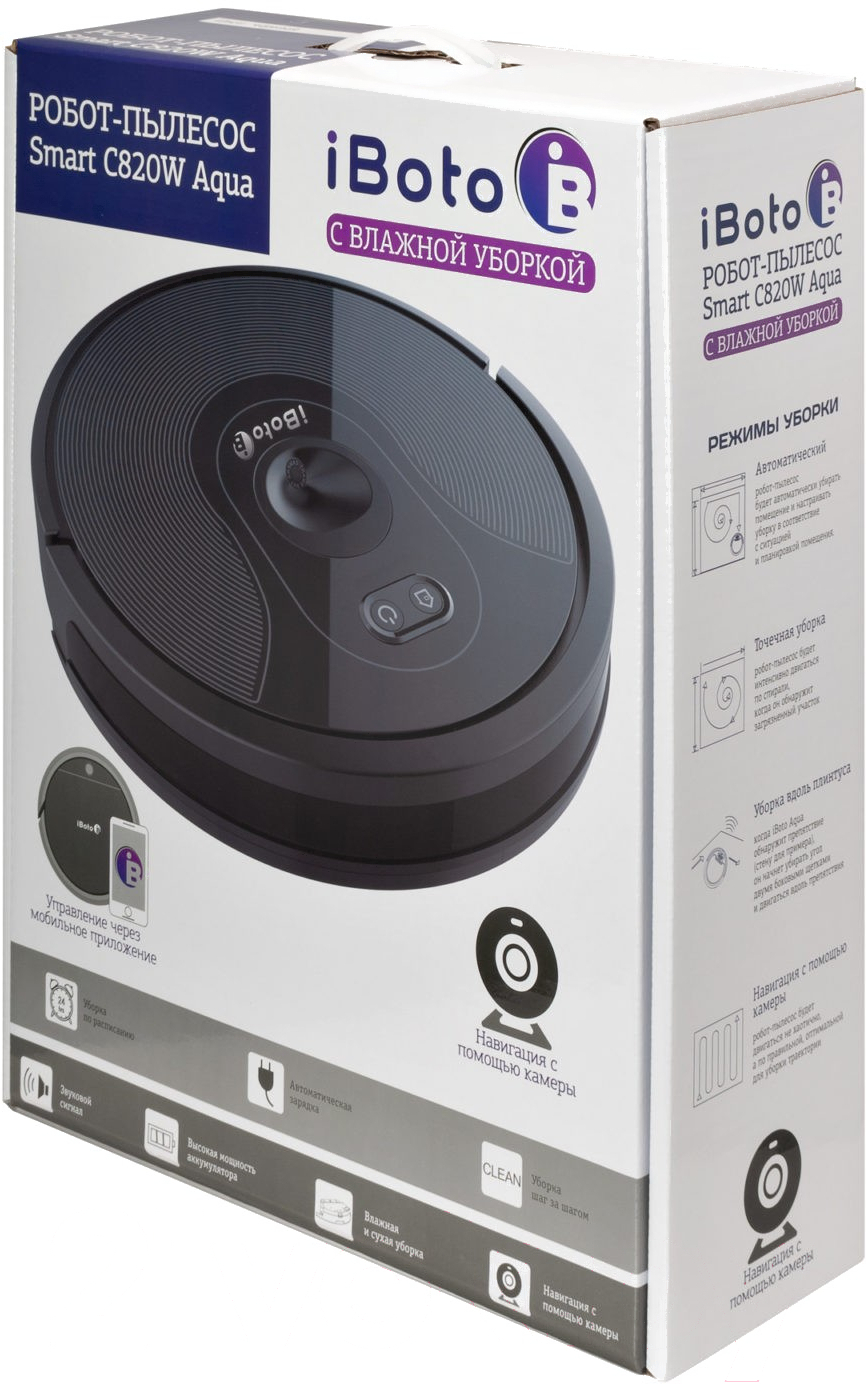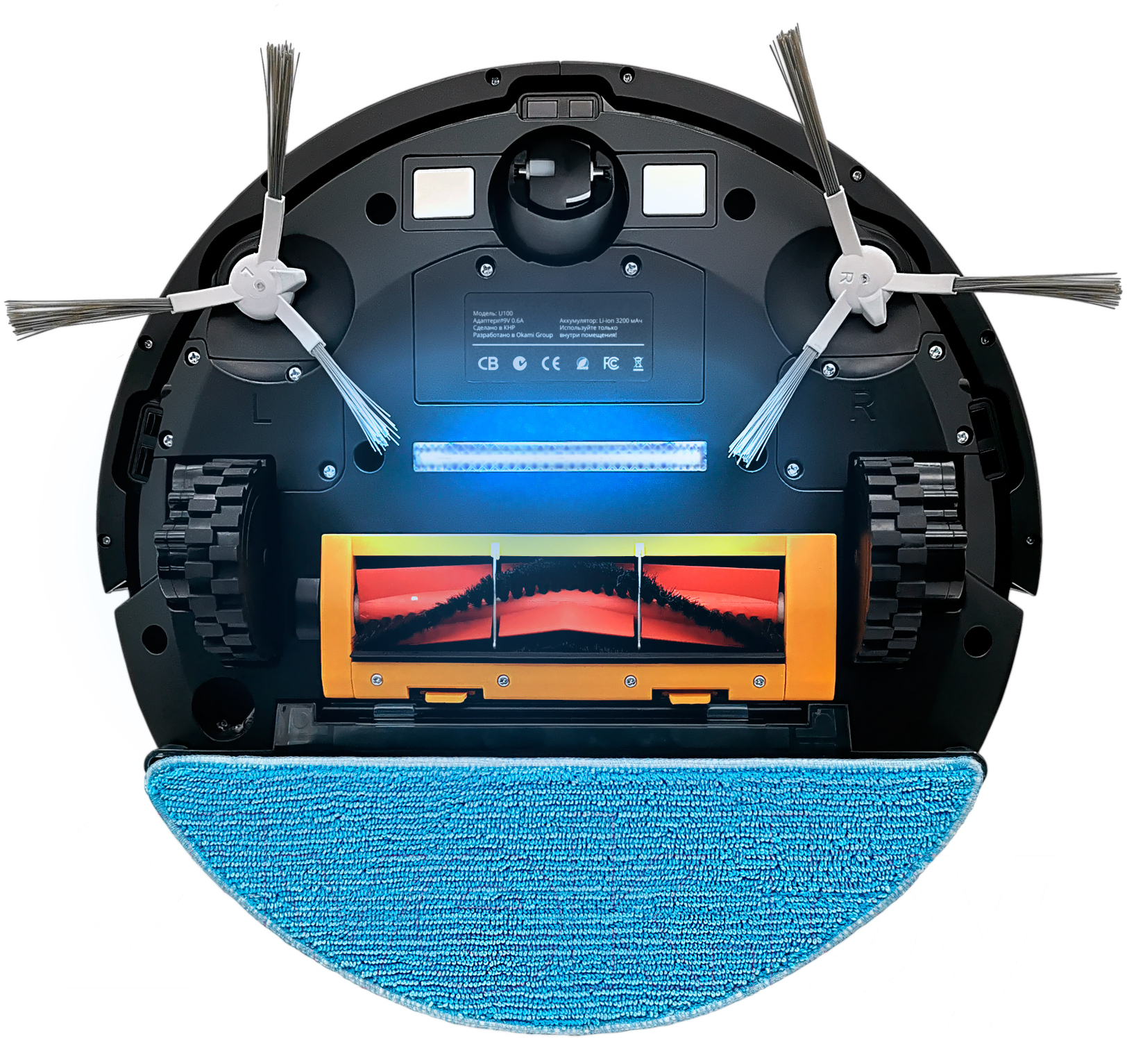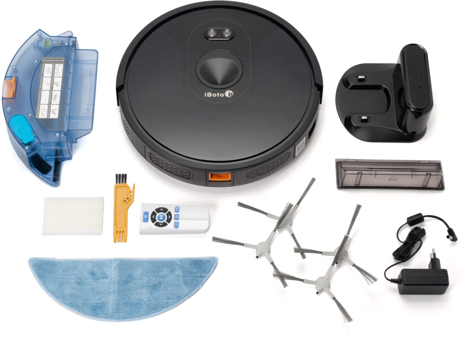• В комплекте контейнер для влажной уборки, зарядная станция, адаптер питания, пульт ДУ, документация, боковая щетка (4 шт), ткань для влажной уборки, фильтр, контейнер для сухой уборки