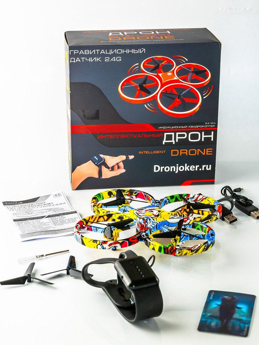 - Комплектация упаковка; браслет; зарядное устройство; отвертка; инструкция; крепление; дрон; комплект запасных винтов - 4 шт.; датчик движения