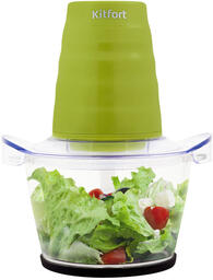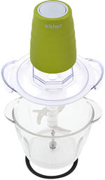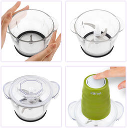 Измельчитель мощностью 400 Вт. Двойной нож из нержавеющей стали. Защитные кожухи для ножей. Стеклянная чаша объемом: 1 л. Материал корпуса: пластик. Измельчитель легко и просто мыть, так как все части разборные.