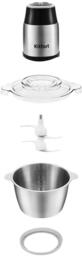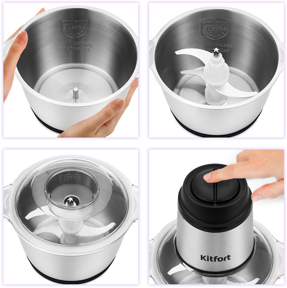 Измельчитель мощностью 350 Вт. Механическое управление. 2 скорости. Двойной нож из нержавеющей стали. Защитные кожухи для ножей. Стальная чаша объемом: 2 л. Материал корпуса: металл/пластик. Благодаря резиновой подкладке под чашу измельчитель меньше скользит по столу. Измельчитель легко и просто мыть, так как все части разборные.