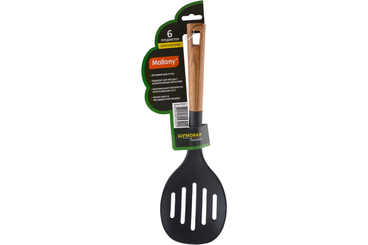 Шумовка Mallony FORESTA из нейлона, с пластиковой ручкой, дизайн под дерево, 34x10,5 см 006462 предназначена для отделения жидкостей от продуктов.Благодаря эргономичной форме удобно лежит в руке.Не токсична, поэтому безопасна для здоровья.За счет высокой прочности шумовка прослужит долго.