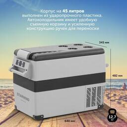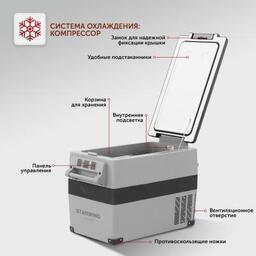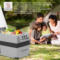 Прочие особенности и свойстваработа от компрессора, охлаждение до -20 С, LED-дисплей, терморегулятор, работа от приложения, освещение корзины, надежные ручки для переноски, подстаканники, ударопрочный пластик