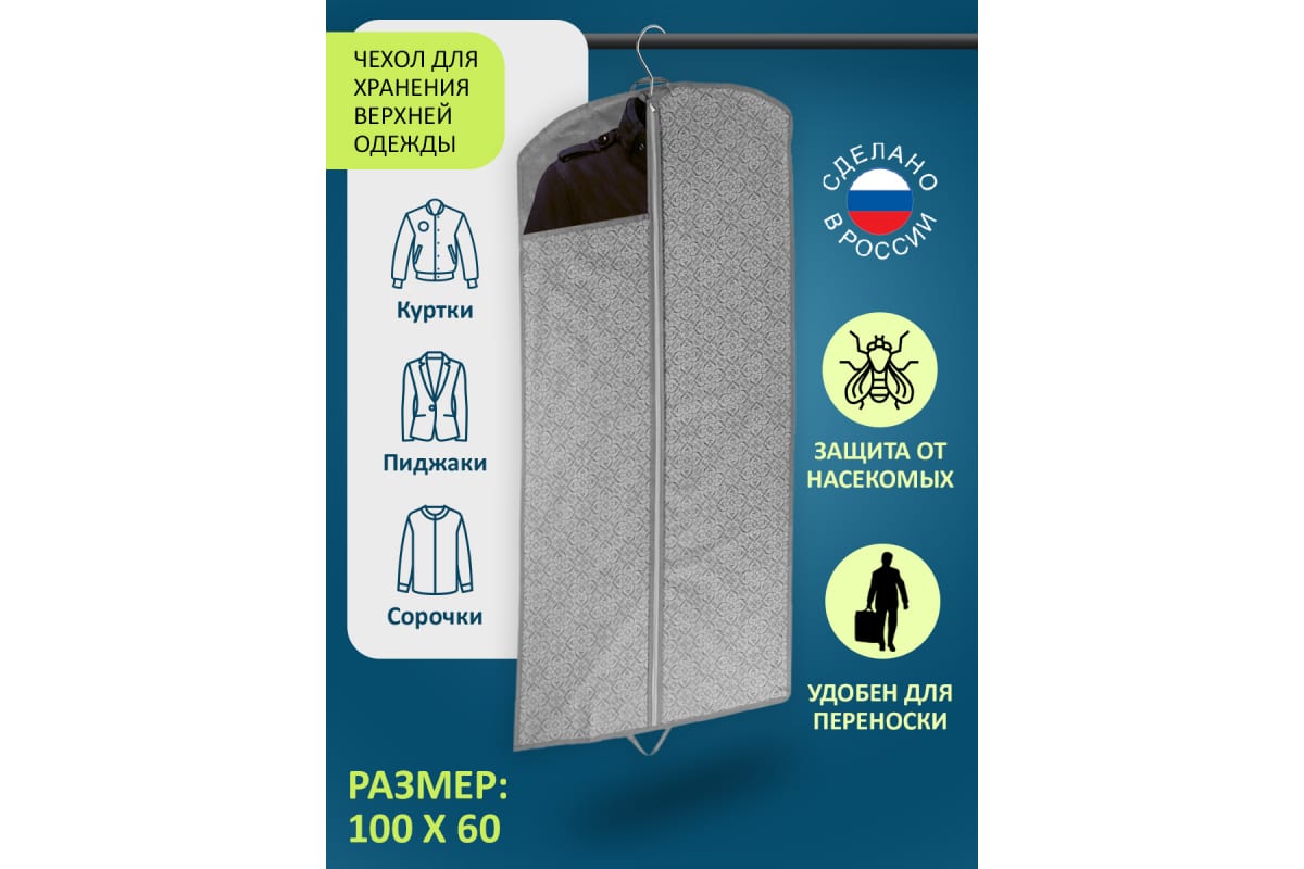 Чехол для хранения верхней одежды ГЕЛЕОС Грей размер 100x60 см ГРЕ-07 предназначен для хранения вещей.Прозрачное окошко из ПВХ позволяет легко рассмотреть содержимое.Имеет удобные ручки для переноски и молнию, адаптированную под сгибы (с кордом).Защищает от моли и насекомых, что продлевает срок службы одежды.