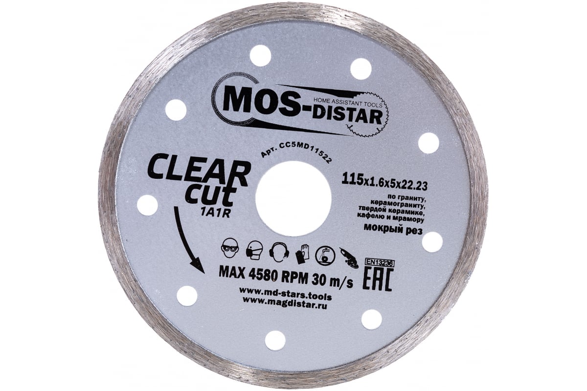 Диск алмазный 1A1R CLEAR CUT или ЧИСТЫЙ РЕЗ 115*1,6*5*22,23 от MOS-DISTAR – сплошной алмазный диск для работы с гранитом, керамогранитом, кафелем и мрамором. Отличительной особенностью этих дисков является их толщина. В своем классе, это одни из самых тонких дисков.Именно толщина важна для точной обработки плитки или гранита, так как чем она меньше, тем точнее, аккуратнее и чище будет рез.