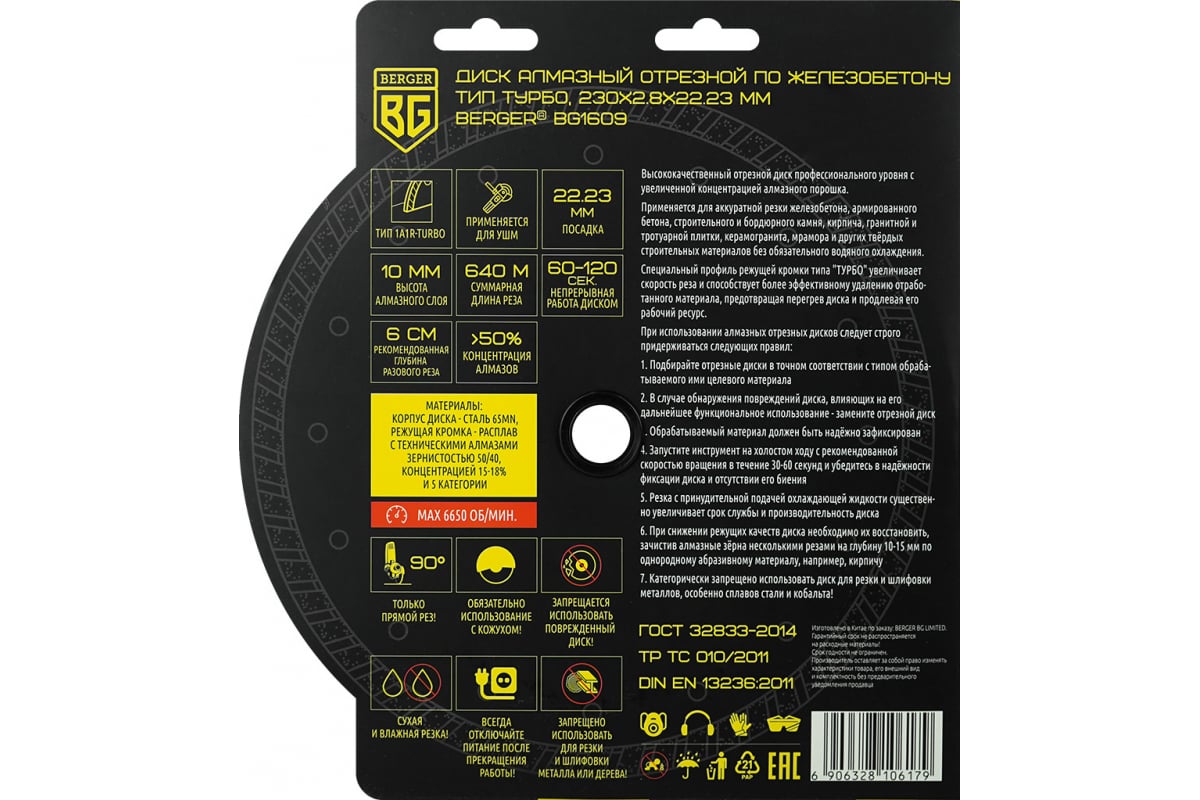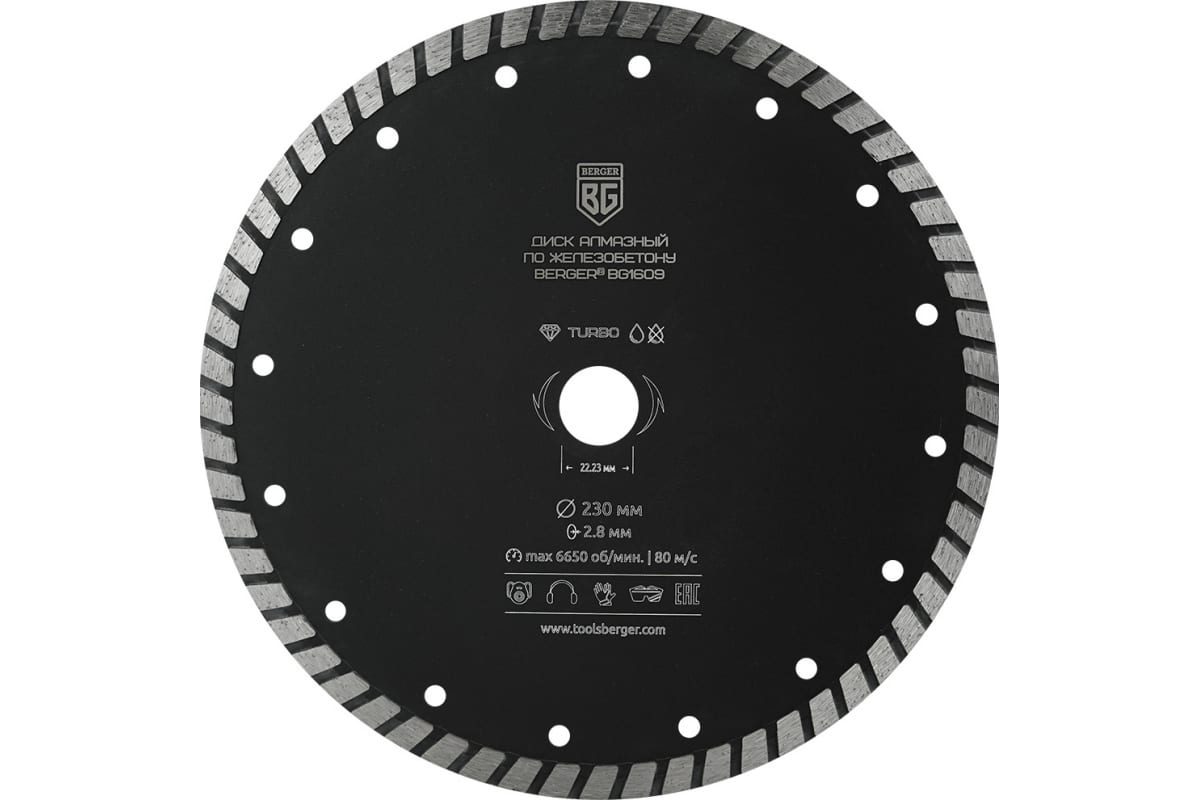 Диск алмазный отрезной по железобетону тип турбо 230x2.8x22.23 мм Berger BG BG1609