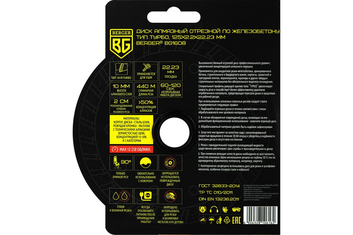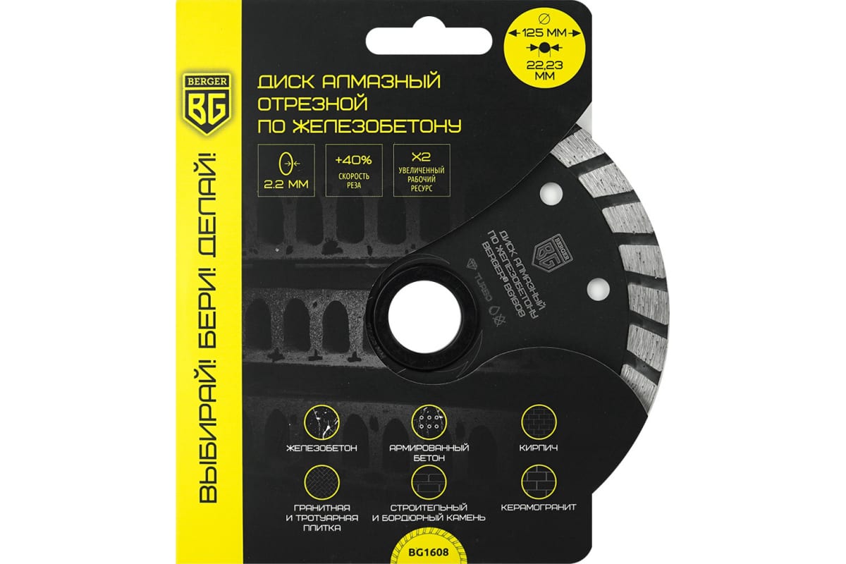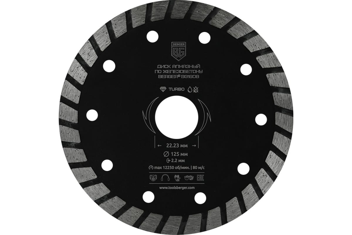 Диск алмазный отрезной по железобетону тип турбо 125x2.2x22.23 мм Berger BG BG1608