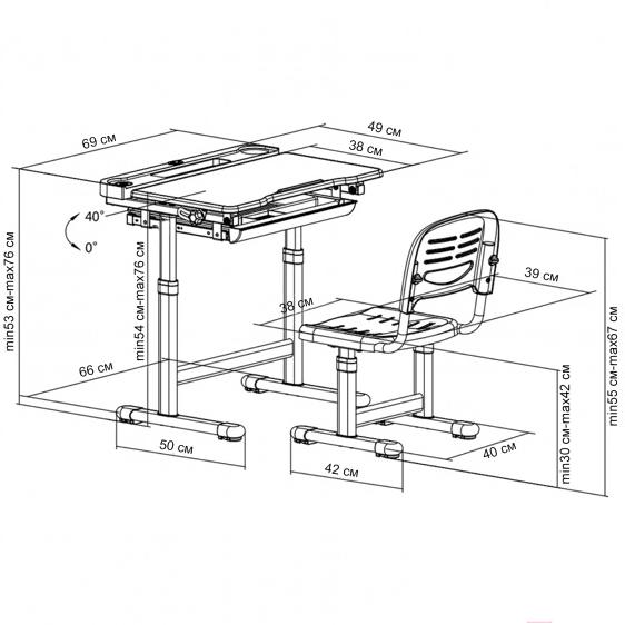 • Регулировка наклон столешницы, высота столешницы, высота стула