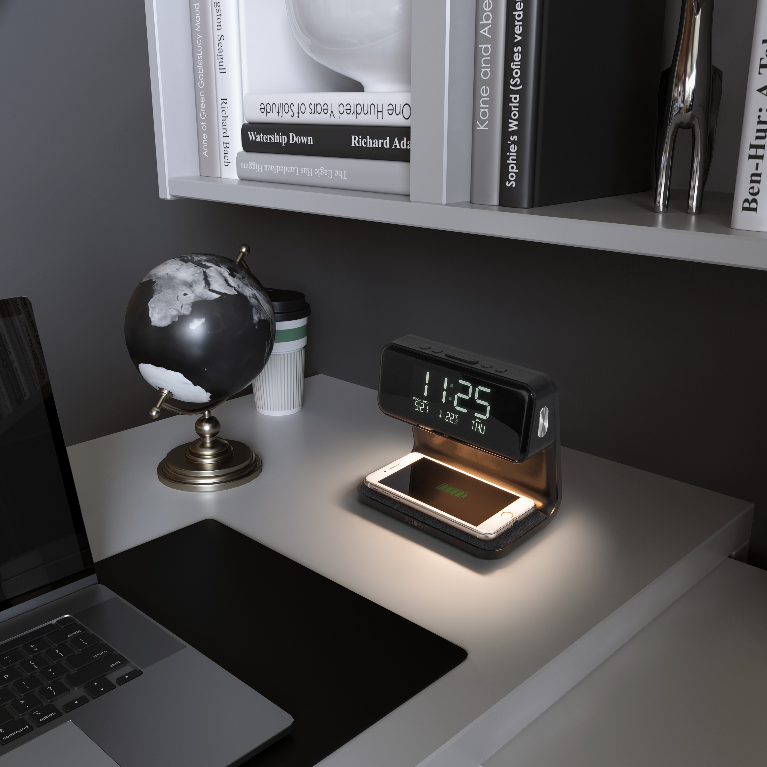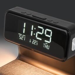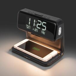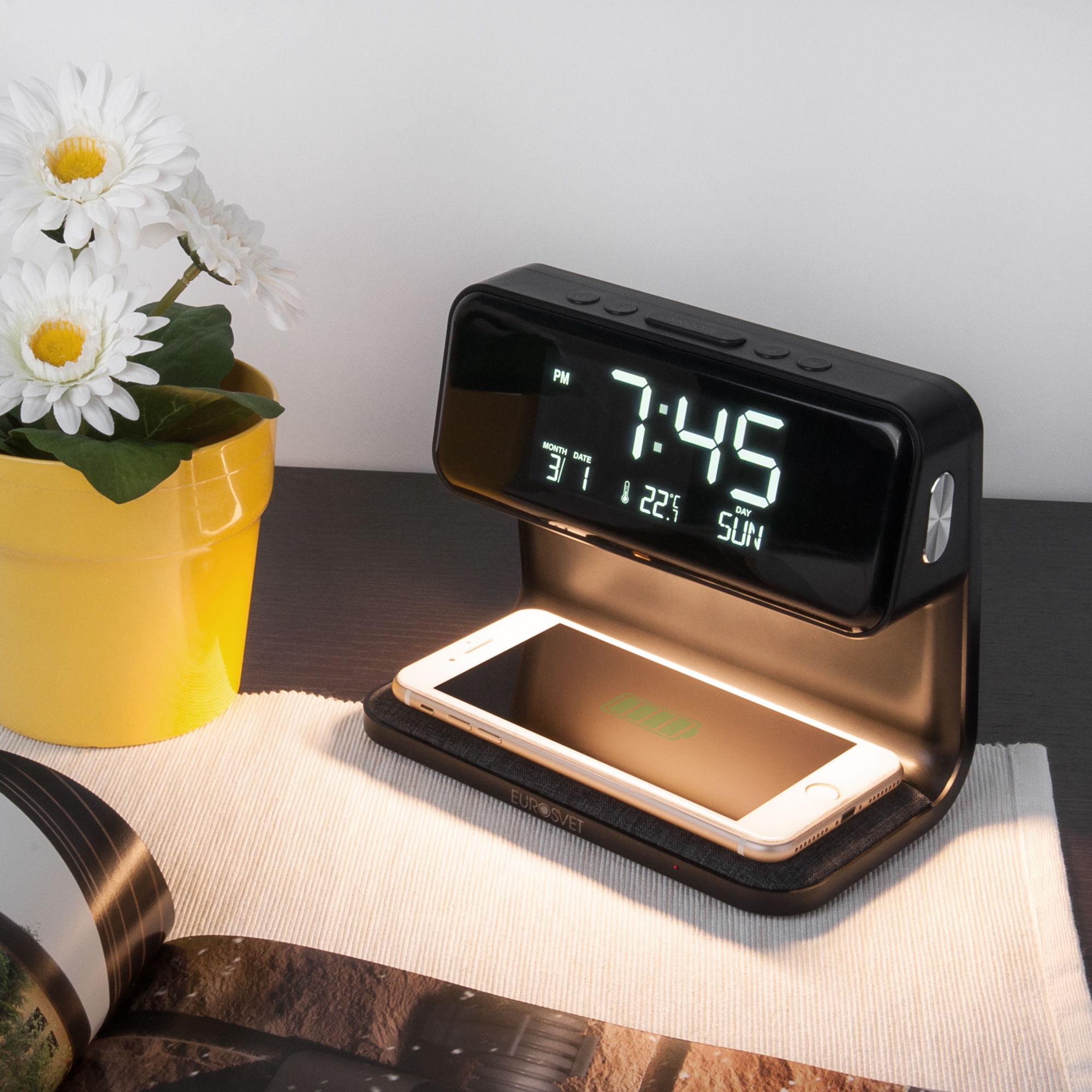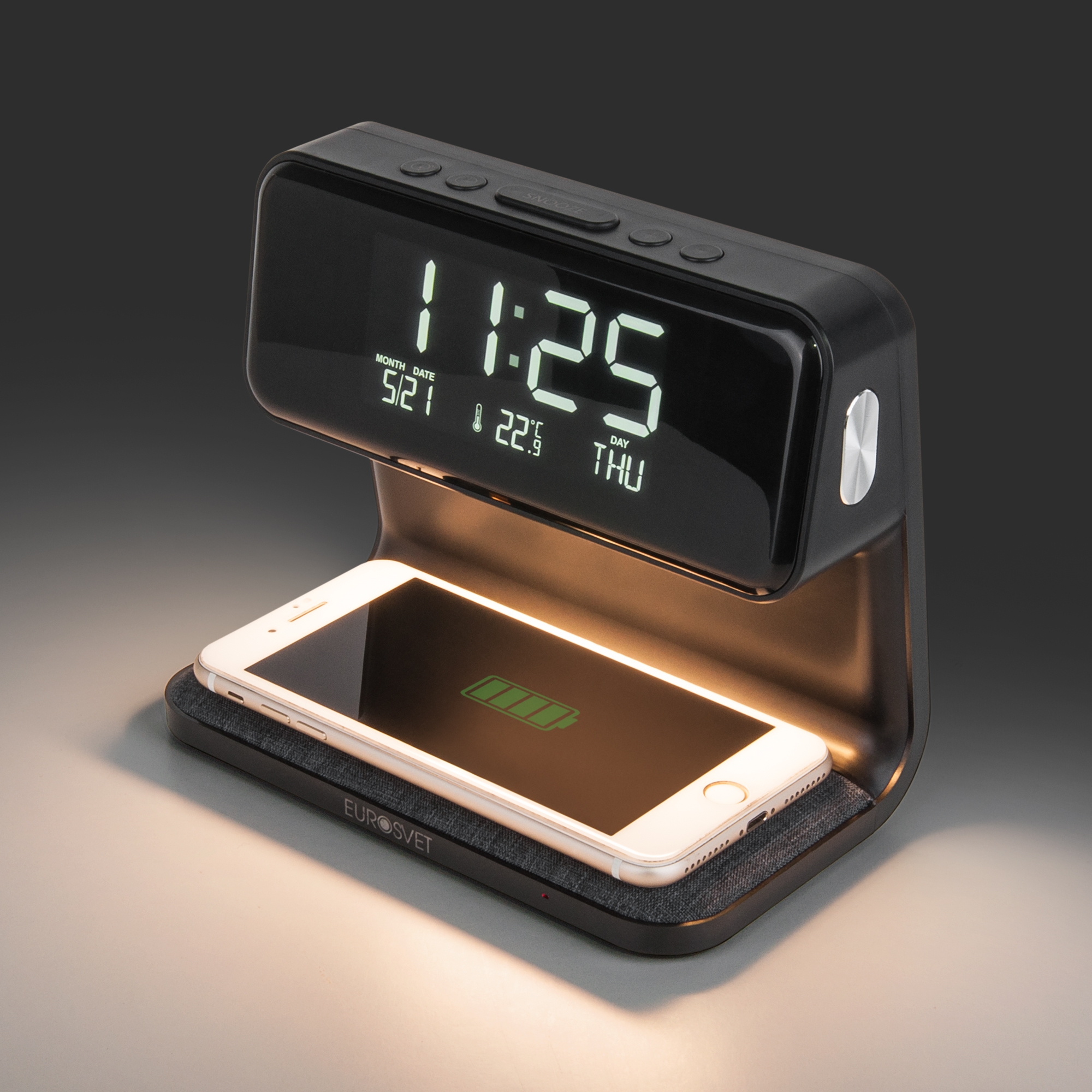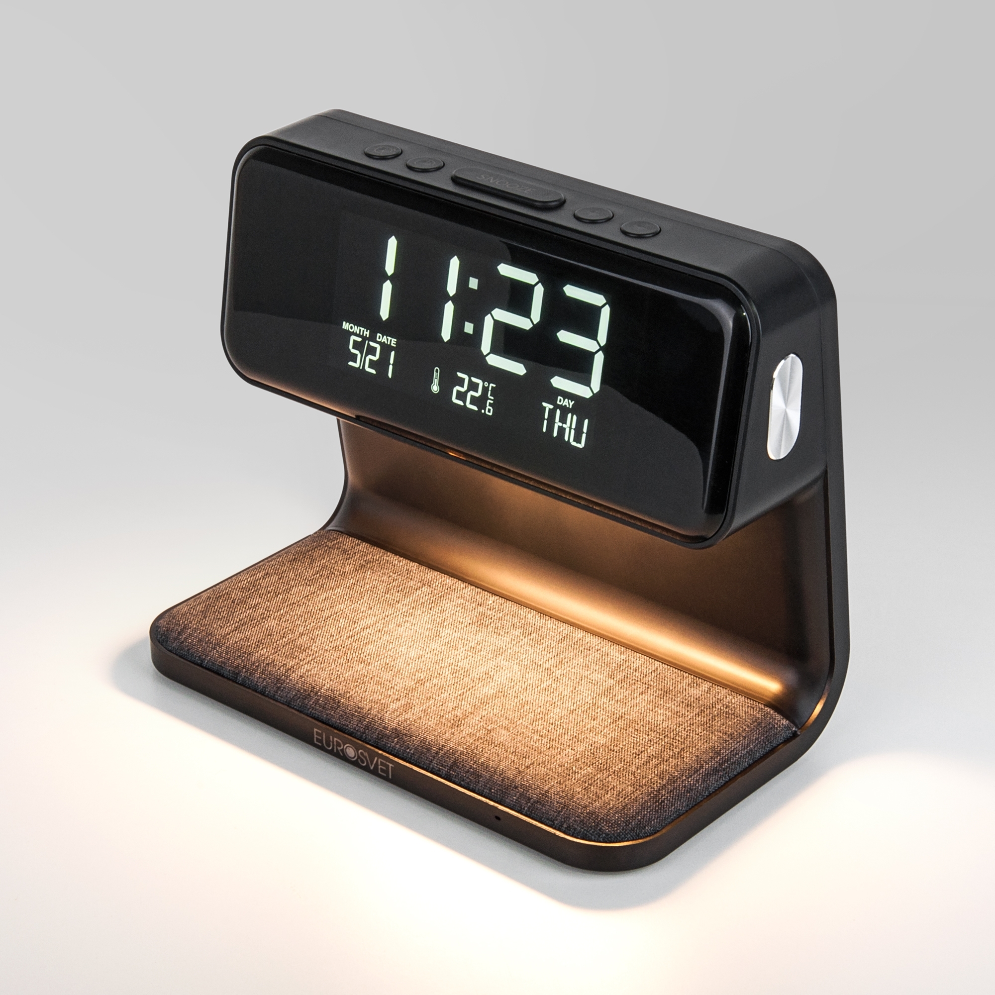 Интерьерная настольная лампа диммируемая светодиодная с выключателем и беспроводным ЗУ, будильником, часами, календарем термометром 80506/1 Eurosvet Smith черный