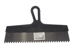 Зубчатый шпатель с антикоррозийным покрытием 350мм зуб 6х6мм Jettools 202-350/6 подходит для работы с клеевыми растворами. Способен выравнивать и распределять их. Можно использовать при укладке: