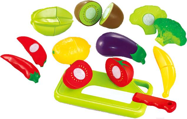 - Продукты в комплекте овощи (перец, баклажан, помидор, брокколи), фрукты (банан, лимон, киви, карамбола)