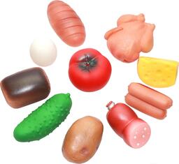 - Продукты в комплекте овощи (картофель, огурец, помидор), яйцо (1 шт), курица (1 шт), сосиски (3 шт), сыр (1 шт), колбаса (1 шт), хлеб (буханка 1 шт, батон 1 шт)