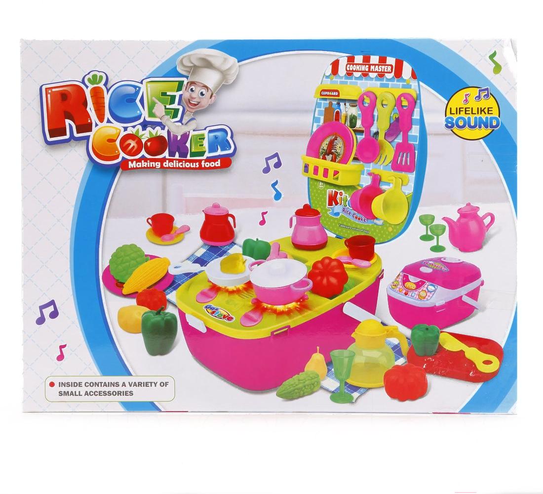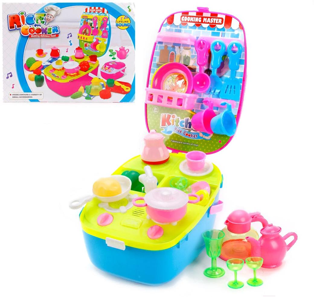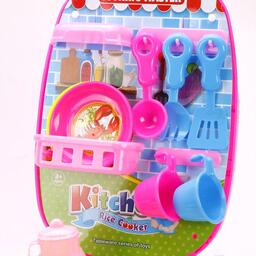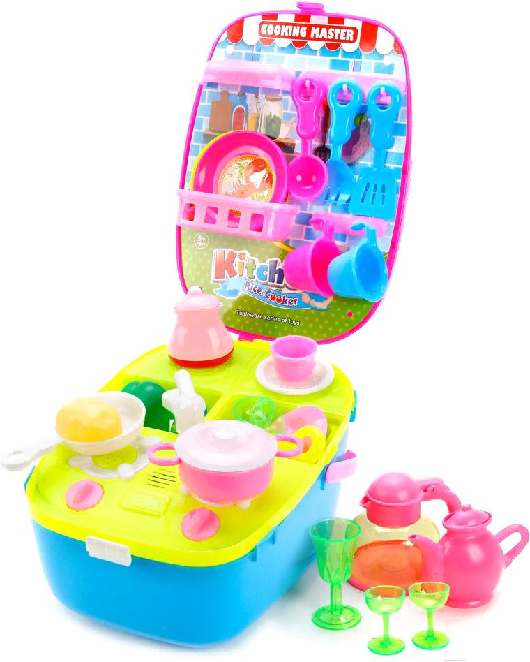 - Посуда в комплекте чашка (3 шт), ложка, нож, кастрюля, сковорода, кухонные приборы (лопатка - 2 шт), тарелка (3 шт), чайник заварочный, кувшин, бокал (3 шт)