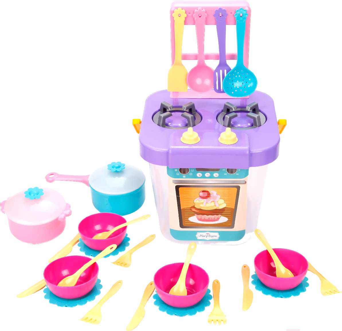 - Посуда в комплекте ложка (4 шт), вилка (4 шт), нож (4 шт), кастрюля (2 шт), кухонные приборы (2 лопатки, половник), тарелка (4 шт), миска (4 шт), дуршлаг
