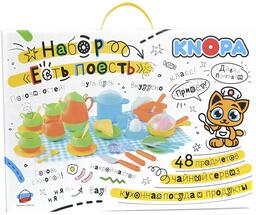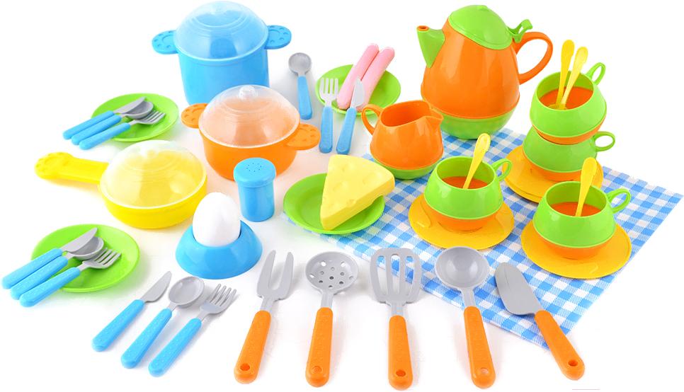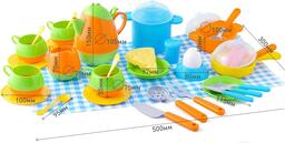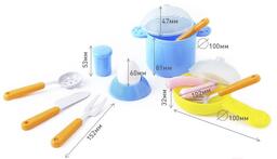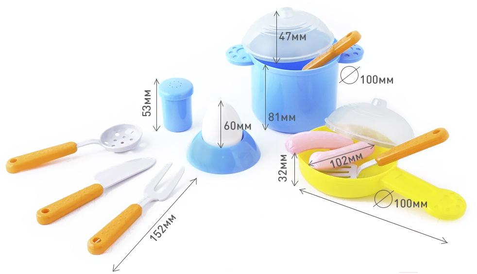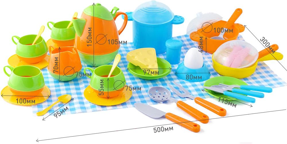 - Посуда в комплекте чашка (4 шт), блюдце (4 шт), ложка (8 шт), вилка (4 шт), нож (5 шт), кастрюля (2 шт), сковорода, кухонные приборы (половник, шумовка, лопатка с прорезями, вилка), тарелка (4 шт), чайник заварочный, солонка, молочник