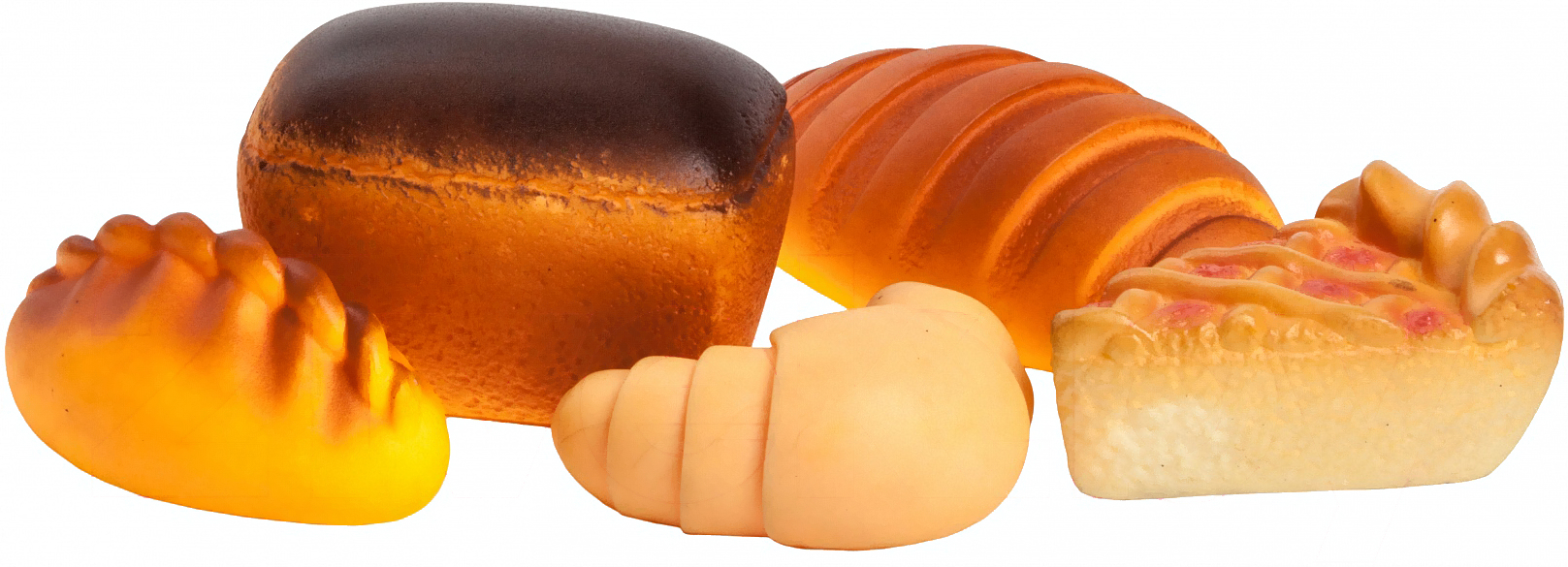 - Продукты в комплекте выпечка (рогалик, батон, сочник, буханка), пирог (кусочек)