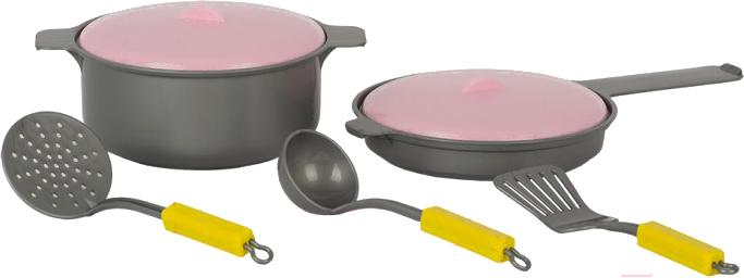 - Посуда в комплекте кастрюля (с крышкой 1 шт), сковорода (с крышкой 1 шт), кухонные приборы (лопатка 1 шт, шумовка 1 шт, )