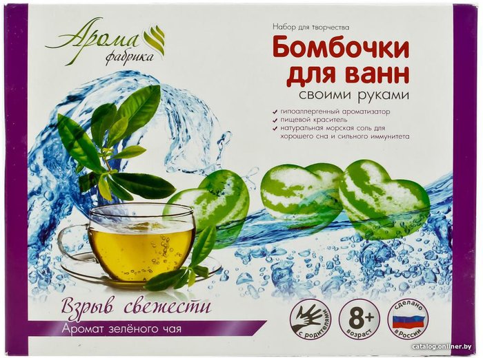- Состав набора гипоаллергенная отдушка (зеленый чай), морская соль, лимонная кислота, пищевая сода, пищевой краситель (зеленый), 2 формочки, палочки для перемешивания, перчатки, одноразовая маска