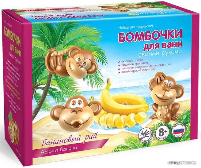 - Состав набора натуральная морская соль, лимонная кислота, пищевая сода, отдушка банан, пищевой краситель желтый, 3 формочки, защитная маска, палочка для смешивания, перчатки, инструкция