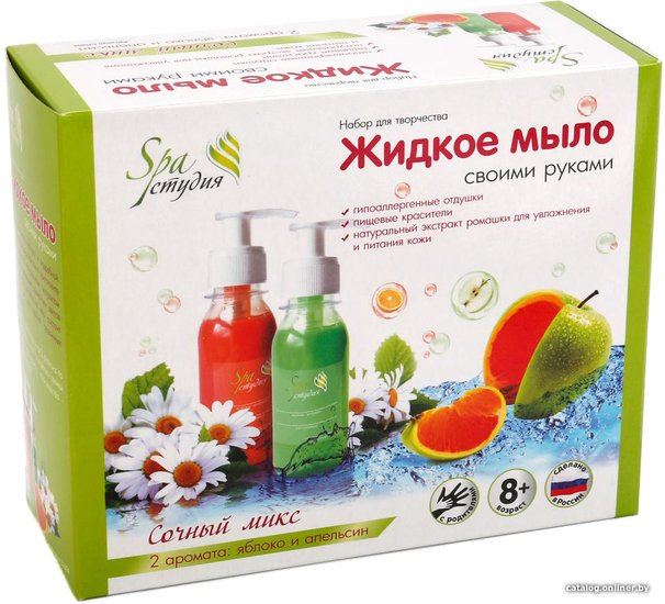 - Состав набора ароматизаторы гипоаллергенные (яблоко, апельсин); мыльная основа; натуральный экстракт ромашки; красители пищевые (зеленый, красный); замутнитель (Lutron); ёмкость для перемешивания; палочки для перемешивания; перчатки; флаконы для мыла (PET) – 2 штуки по 100 мл; стакан мерный; наклейки.