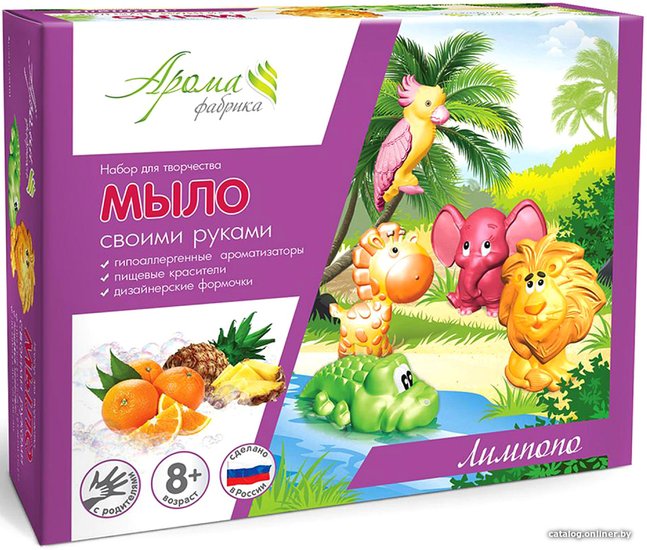 - Состав набора основа для мыла, ароматизатор гипоалергенный (ананас и апельсин), краситель пищевой (оранжевый, зеленый, малиновый), формочки для мыла – 5 штук, емкость для перемешивания, перчатки, инструкция