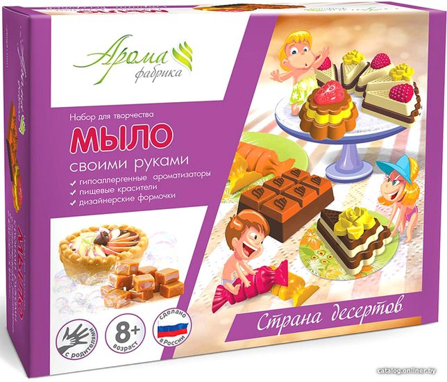 - Состав набора ароматизатор гипоаллергенный (ириска, яблочный пирог); краситель пищевой (желтый, красный, коричневый); основа для мыла; формочка (5 штук); емкость для перемешивания (РР); палочки для перемешивания; перчатки; инструкция