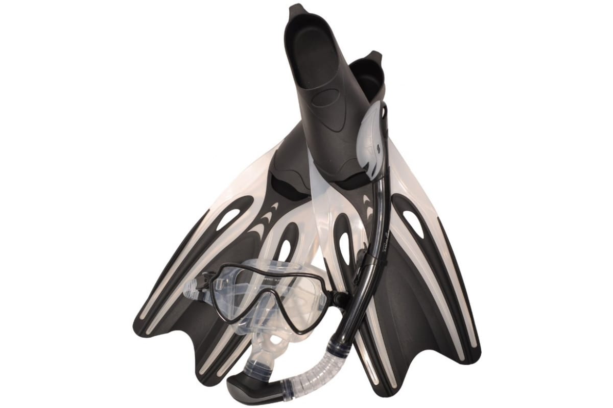 Комплект для плавания: маска + трубка + ласты WAVE черно-серый, р. 39-41 MSF-1390S65F69_39-41 гарантирует комфортное и безопасное погружение. Ласты имеют лопасти в форме рыбы, что увеличивает эффективность гребка. Дренажные отверстия уменьшают сопротивление и обеспечивают пространственную стабилизацию. Маска с обтюратором из силикона защищает от проникновения воды, а ее нескользящий ремешок надежно обхватывает голову. Эластичный загубник трубки закреплен под идеальным углом - для более удобного захвата. Для продувки изделия после использования предусмотрен силиконовый клапан.