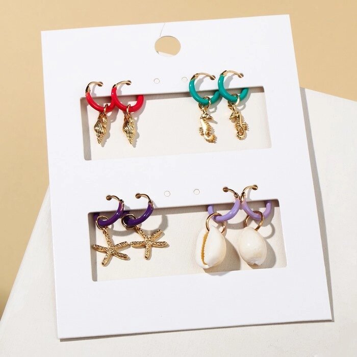 Набор серьги 4 пары "Море" ракушка, звезда, конёк, цветные в золоте