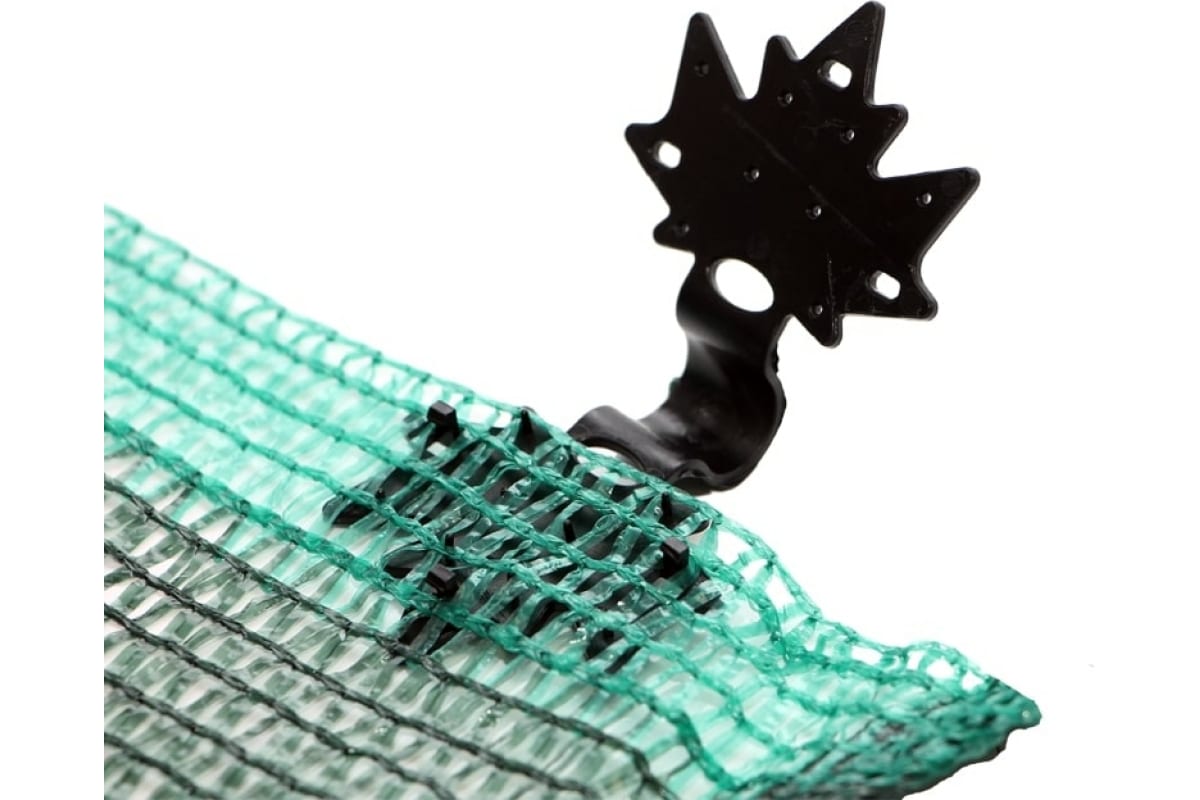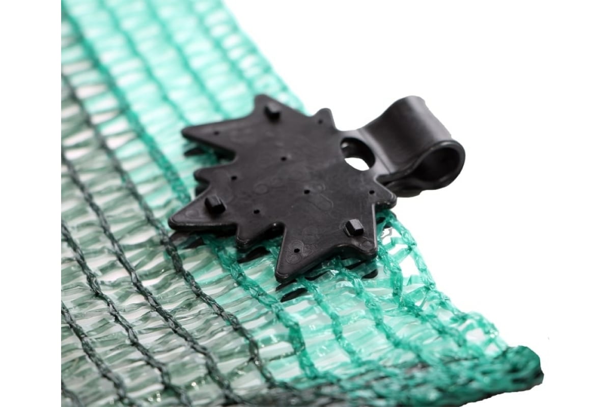 Клипса позволяет произвести тугую натяжку полотна с помощью веревки и обеспечивает надежную фиксацию при сильных порывах ветра. Благодаря использованию клипсы, сетка не рвется в местах креплений и прослужит дольше.