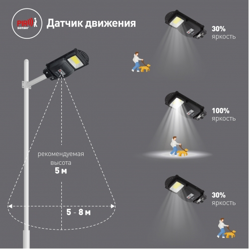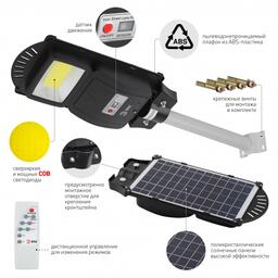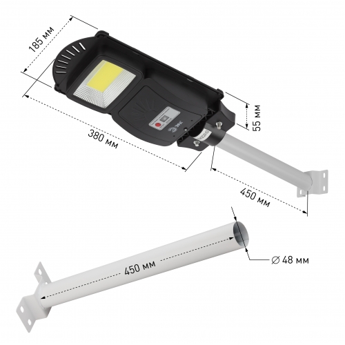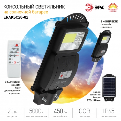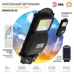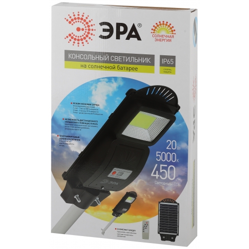ЭРА Консольный светильник на солн. бат.,COB,с кронштейном,20W, с датч.движ., ПДУ, 450lm, 5000К, IP65