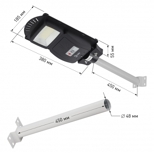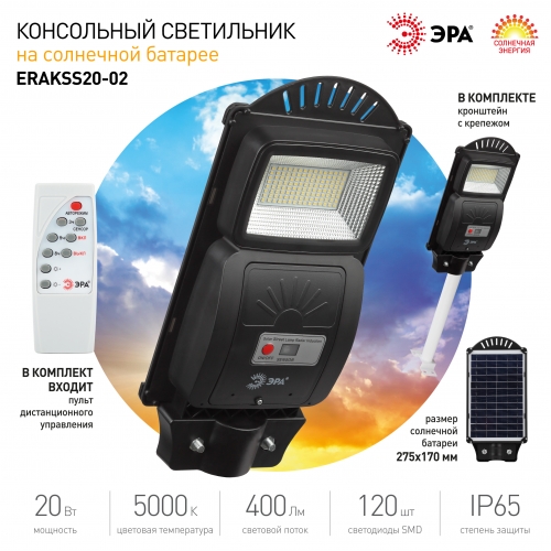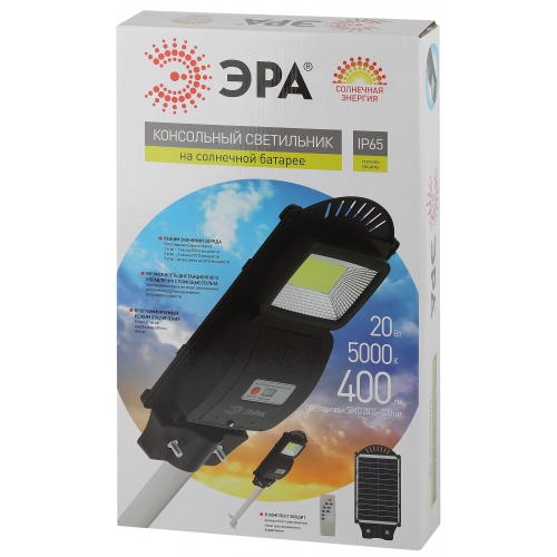ЭРА Консольный светильник на солн. бат.,SMD,с кронштейном,20W, с датч. движ.,ПДУ,400lm, 5000К, IP65