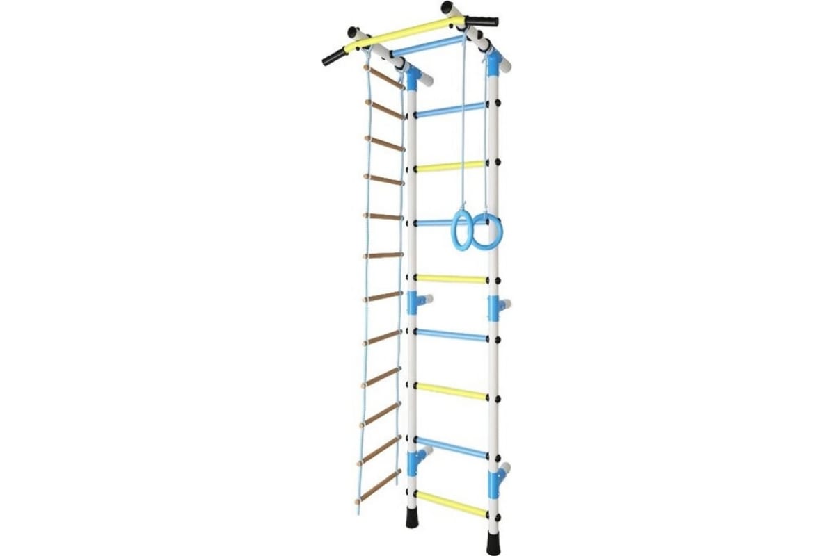 В конструкции этого спортивного комплекса предусмотрено несколько элементов: рама со ступеньками-перекладинами, турник, верёвочная лестница и гимнастические кольца. Способ монтажа – к стене.