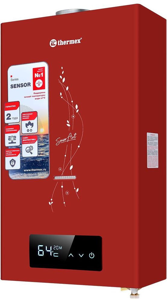 Водонагреватель проточный, газовый нагрев, мощность 20 кВт, производительность 10 л/мин, вертикальная установка, подводка нижняя, защита от перегрева.