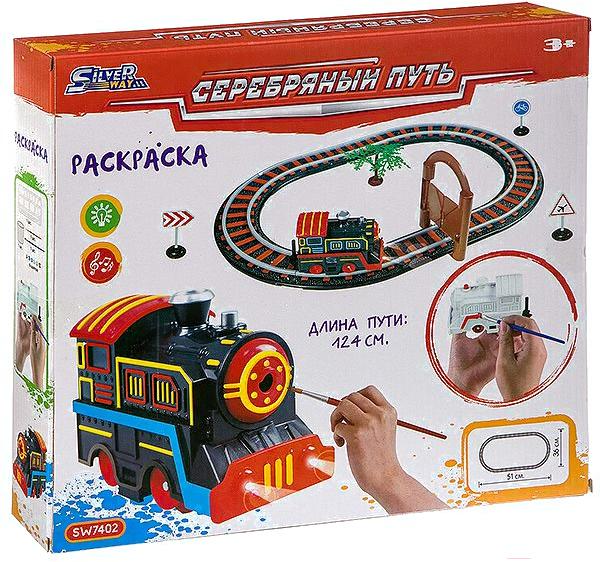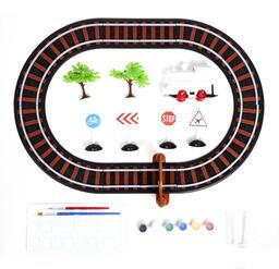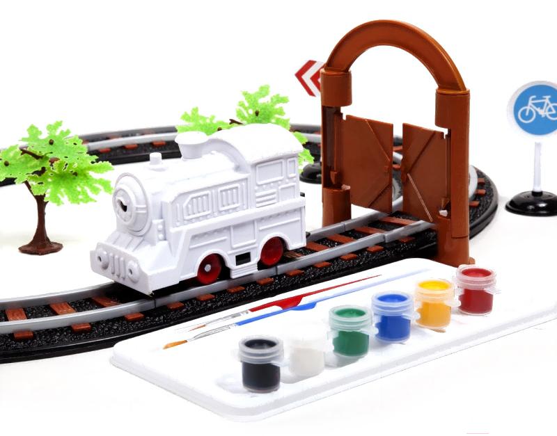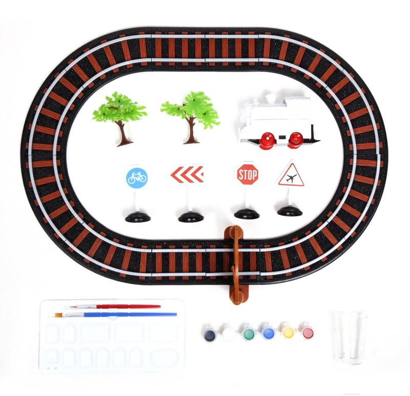- В наборе поезд, рельсы, дерево/растение/цветок, дорожный знак, ворота, краски (шесть цветов), кисточка, стакан