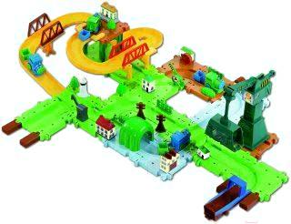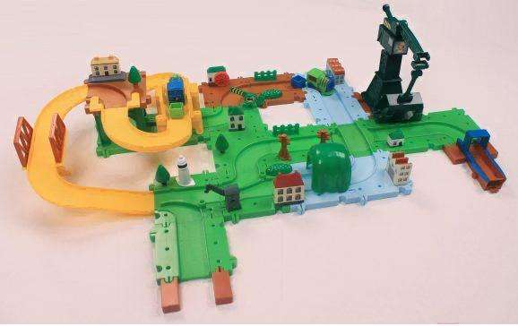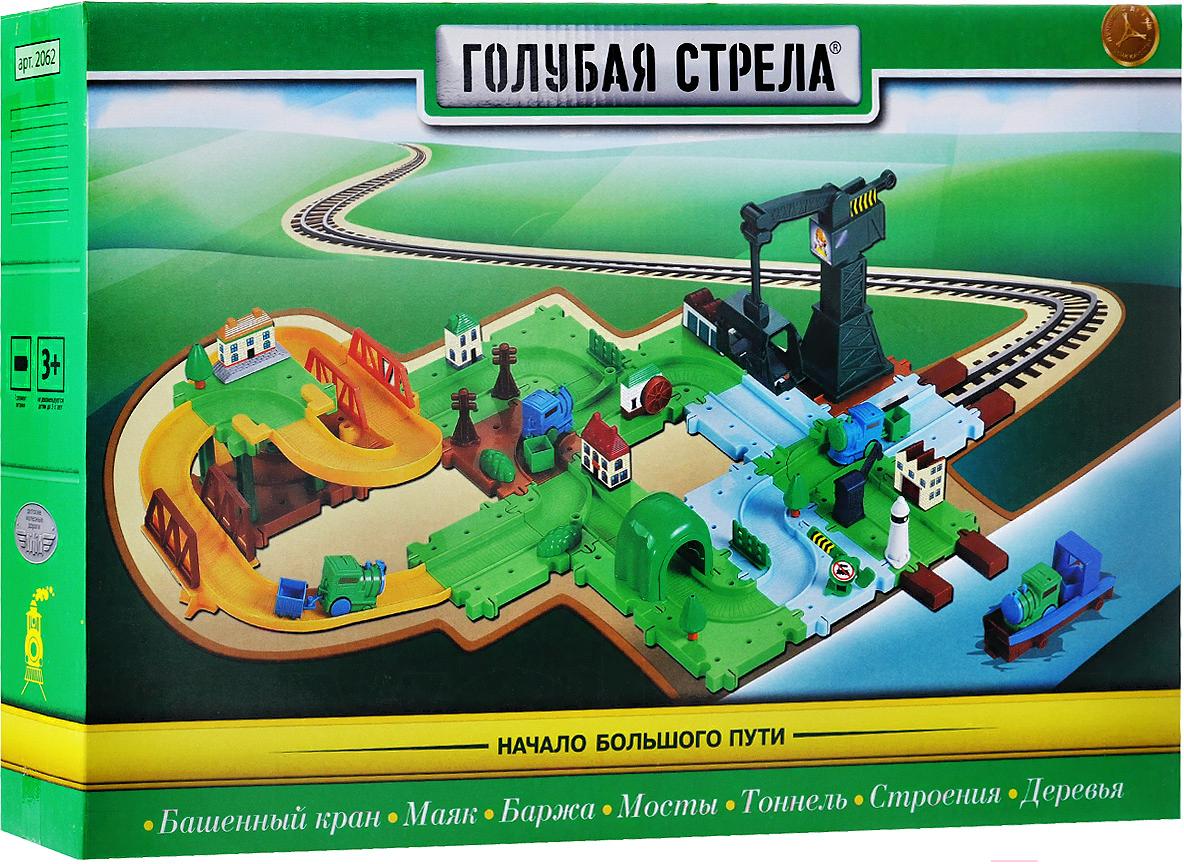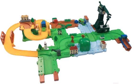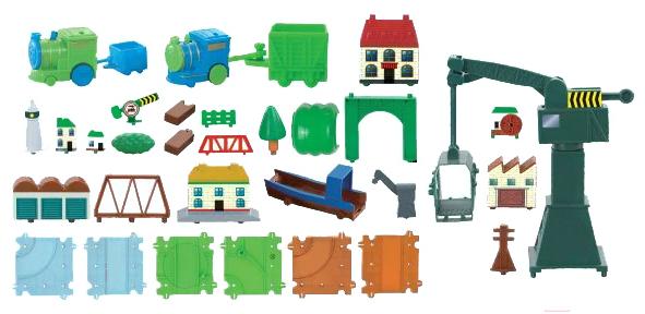 - В наборе поезд (2 шт), вагон (2 шт), рельсы, тоннель, мост, здание/сооружение, транспорт/техника, дерево/растение/цветок, подъемный кран, забор
