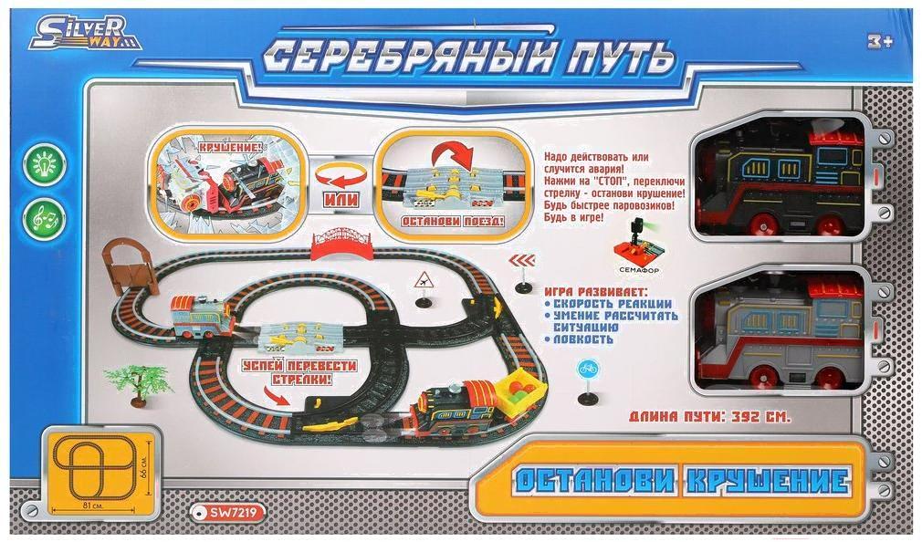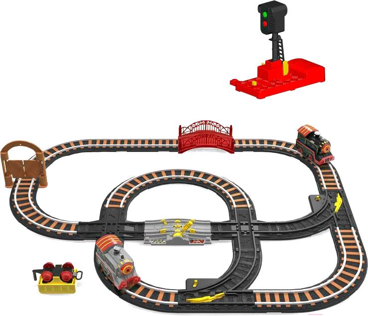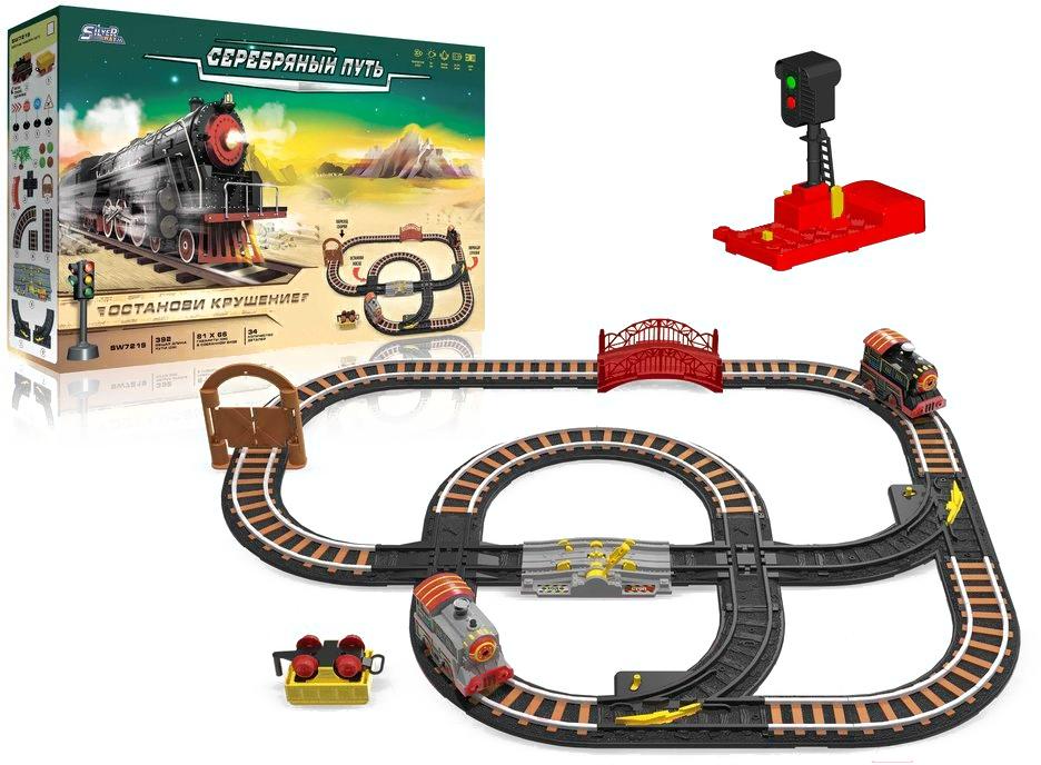 - В наборе локомотив (2 шт.), вагон, рельсы, стрелочный перевод, мост, дерево/растение/цветок, семафор, дорожный знак, ворота