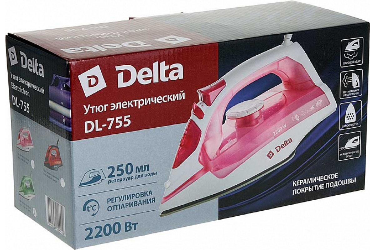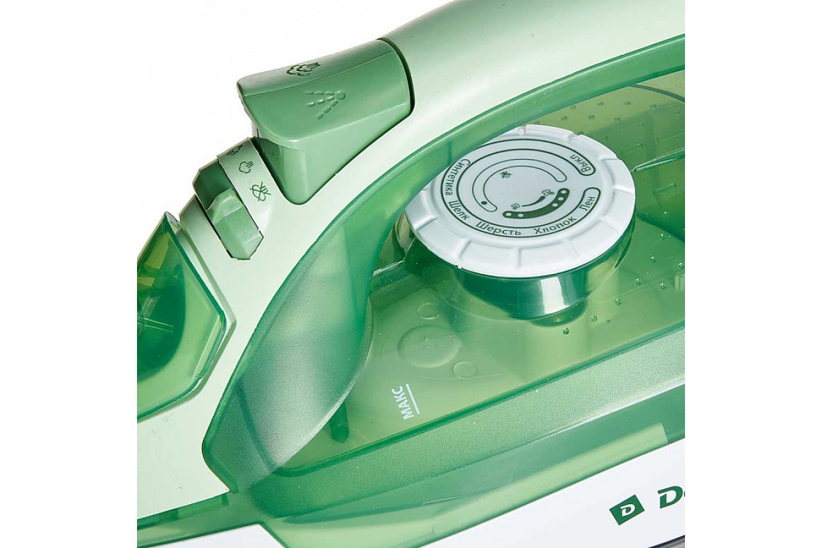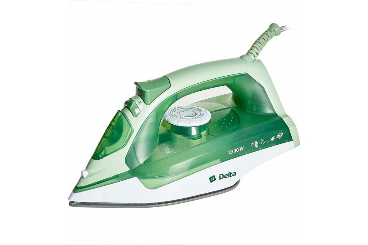 Утюг DELTA DL-755 зеленый с белым, 2200 Вт, керамика, самоочистка, паровой удар 10 0R-00002761 предназначен для глажения белья, домашнего текстиля, одежды.