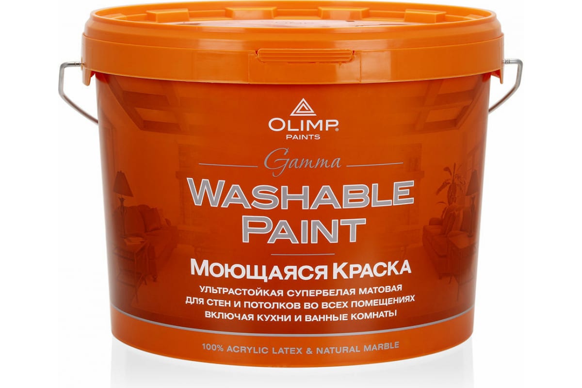 Краска ультрастойкая моющаяся для всех типов помещений OLIMP ГАММА 10 л 9965 - матовая моющаяся ультрастойкая акриловая краска для стен и потолков в помещениях с повышенной влажностью. Образует поверхность с высокой стойкостью к загрязнению, истиранию и влажности, ее можно многократно мыть с применением неабразивных бытовых моющих средств. Краска обладает высокой степенью белизны, укрывистости и устойчивости к растрескиванию.