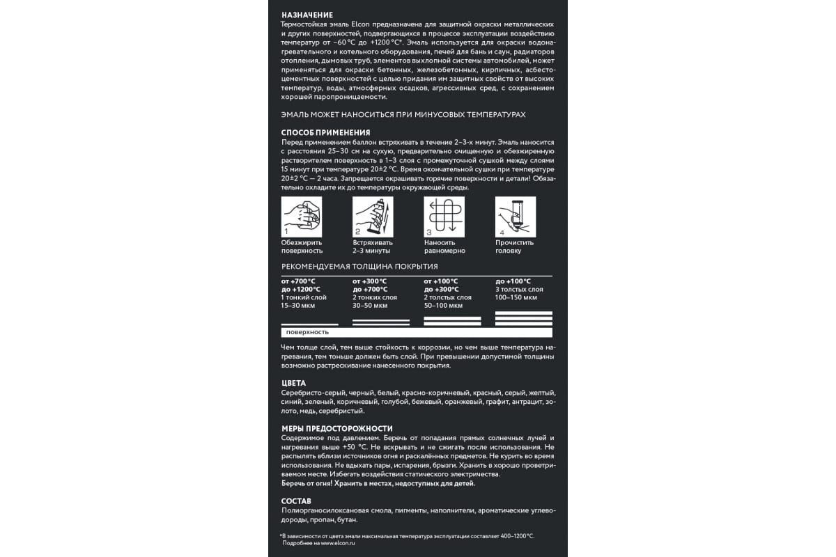 Термостойкая эмаль Elcon Max Therm голубая, 400 градусов, аэрозоль 520 мл предназначена для защитно-декоративного окрашивания поверхностей и различного оборудования в помещениях с высоким перепадом температур.Состав подходит для обработки металла, бетона, асбеста, железобетона, кирпича, печей, каминов, мангалов, дымоходов, котлов, газо-, нефте- и трубопроводов.Продукт легко наносится и быстро сохнет, образуя равномерное паропроницаемое покрытие, устойчивое к образованию коррозии, воздействию блуждающего тока, влаги, солевых растворов, минеральных масел и нефтепродуктов.