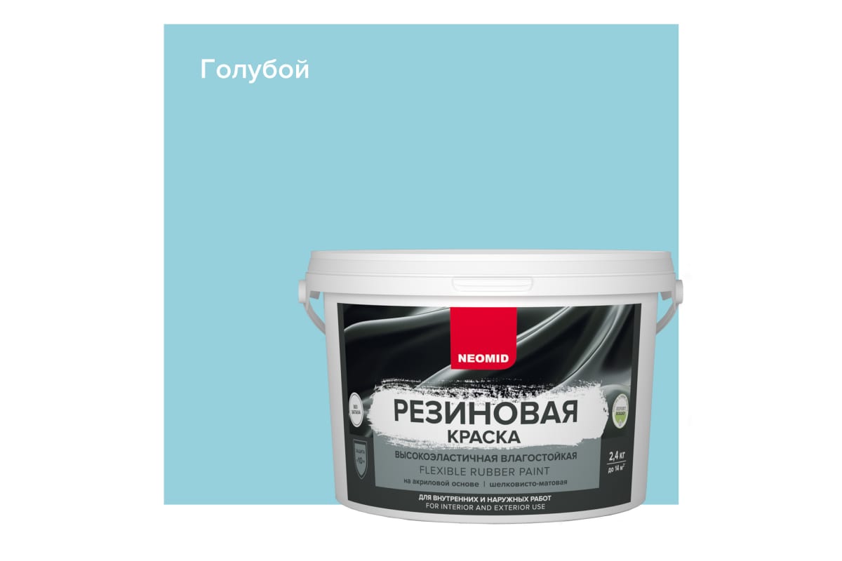 Резиновая краска Neomid Голубой 2,4 кг Н-КраскаРез-2,4-Гол предназначена для защитно-декоративной окраски поверхностей из дерева, ДСП, ЦСП, ДВП, OSB, бетона, газобетона, материалов жесткой и мягкой кровли (шифер, черепица, гибкая черепица, профнастил, оцинкованное железо).