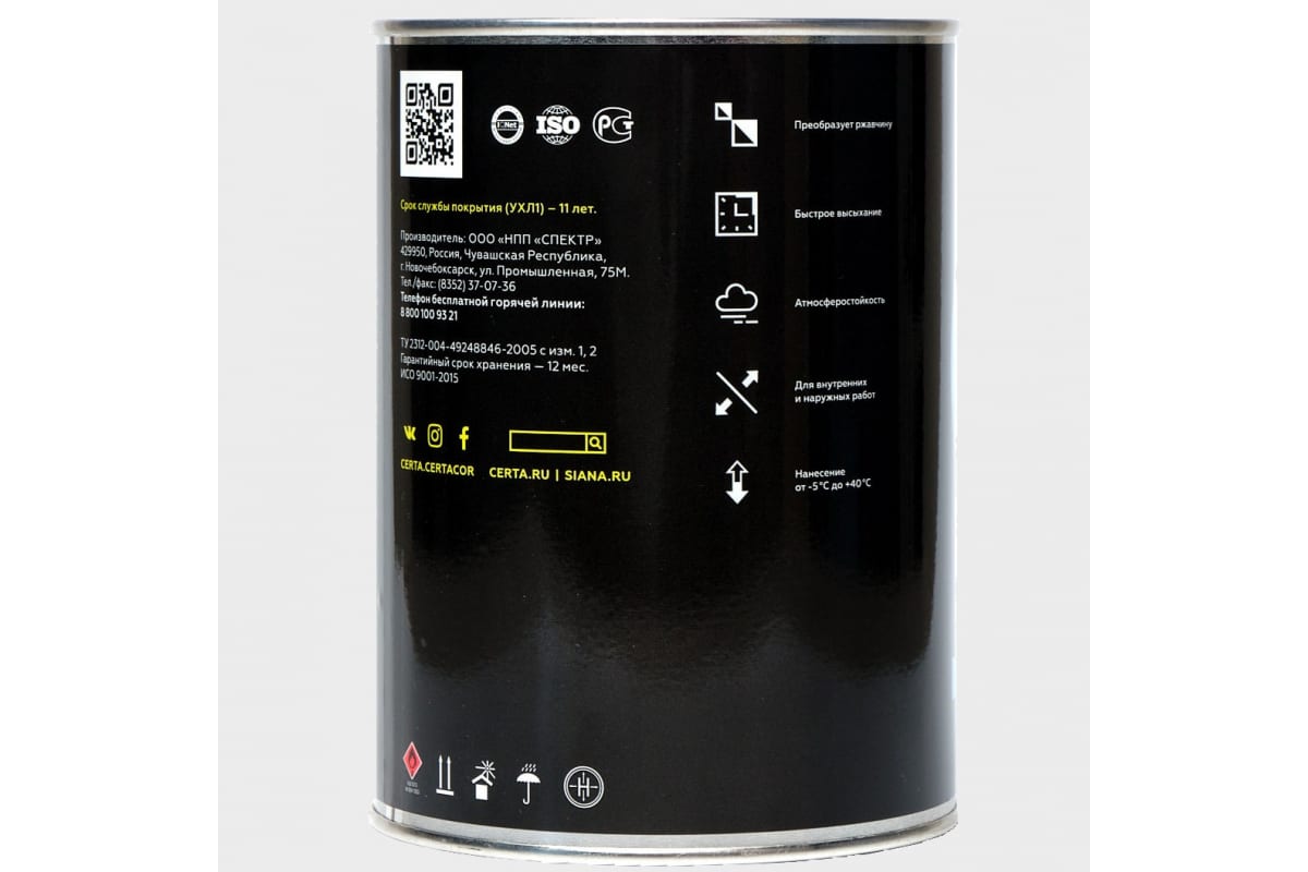 Краска по металлу CERTA 3 в 1 (по ржавчине; графит темный; 0.8 кг) KRGL0033 предназначена для металлических поверхностей с толщиной прочно связанной ржавчины до 50 мкм. Сочетает в себе свойства преобразователя ржавчины, антикоррозийной грунтовки и финишной декоративной эмали, позволяет применять её для защиты от ржавчины и декоративной отделки металлических, железобетонных конструкций, стальных и алюминиевых поверхностей: крыш, водостоков, трубопроводов, линий электропередач, спецтехники. Хранить в плотно закрытой таре в сухом помещении, предохраняемом от прямого воздействия солнечных лучей и влаги, при температуре от −30°С до +40°С. Беречь от огня.