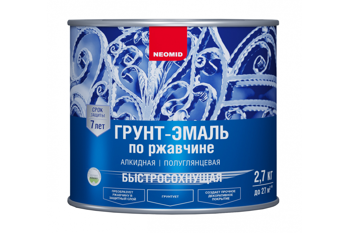 Быстросохнущая грунт-эмаль 3в1 Neomid красный RAL 3020 2.7 кг Н-FdCoat-2,7/крас используют внутри и снаружи помещений для окрашивания металлических конструкций. Продут подходит для обработки оцинкованных поверхностей, пораженных ржавчиной.
