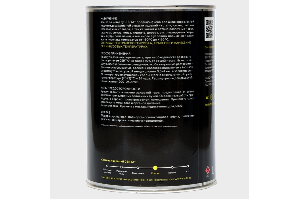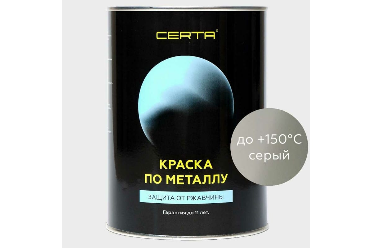 Краска по металлу Certa (серый; 0.8 кг) KRGL0014 предназначена для антикоррозионной защиты и декоративной окраски изделий из стали, чугуна, цветных металлов и их сплавов, а также камня и бетона различных марок, керамики, стекла, гипса, кирпича, дерева, эксплуатируемых снаружи и внутри помещений, в том числе в условиях повышенной влажности, перепада температур от −60°С до +150°С.