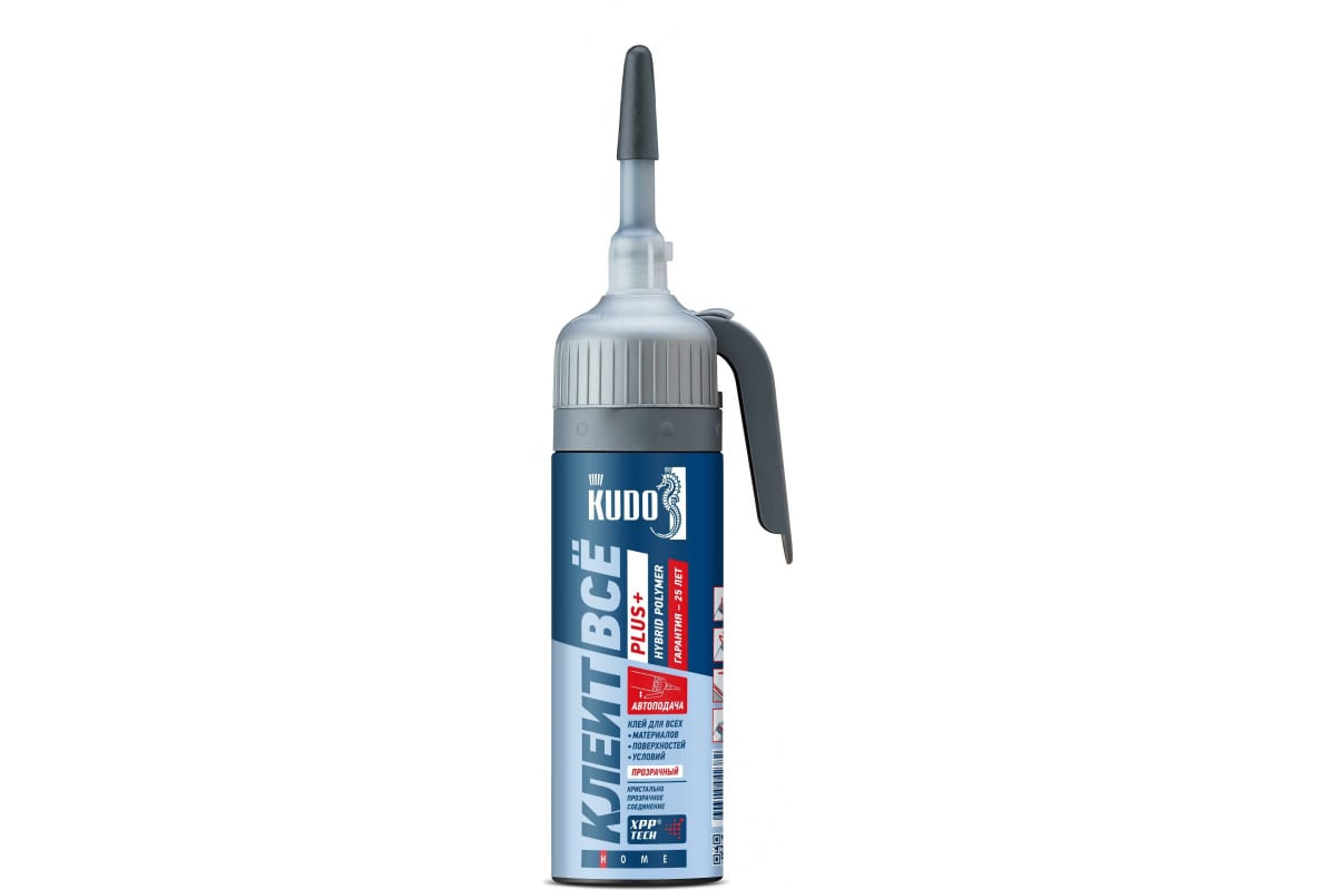 Клей KUDO Клеит Все PLUS+ на основе гибридных полимеров с автоподачей, прозрачный КХ-А05Т 100 мл 11606570 предназначен для создания высокопрочных постоянно эластичных клеевых соединений и герметизирующих швов. KUDO 'КЛЕИТ ВСЁ' PLUS+ используется для монтажа строительных и декоративных элементов (зеркал, подоконников, дверных порогов, систем кондиционирования и вентиляции, лестничных ступеней и т.п.) на бетонные, кирпичные, каменные, металлические, деревянные и другие поверхности (кроме поверхностей из полиэтилена, полипропилена и фторопласта). Прозрачный гибридный клей-герметик рекомендуется для сборки стеклянной мебели, крепления небольших стёкол и зеркал, молдингов, плинтусов в местах, где важен прозрачный клеевой шов. Не токсичен и не горюч. Не содержит изоцианатов, растворителей и силиконов. Не требует предварительного грунтования, допускается наносить на влажные поверхности. Для внутренних и наружных работ.