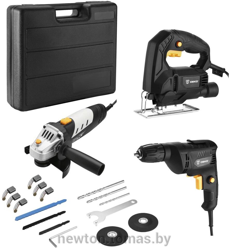 - Состав набора угловая шлифовальная машина, лобзик, электродрель